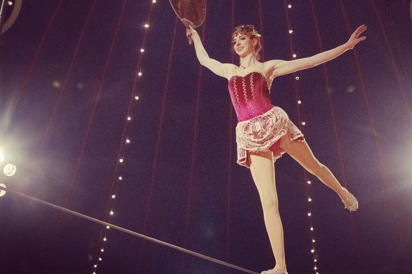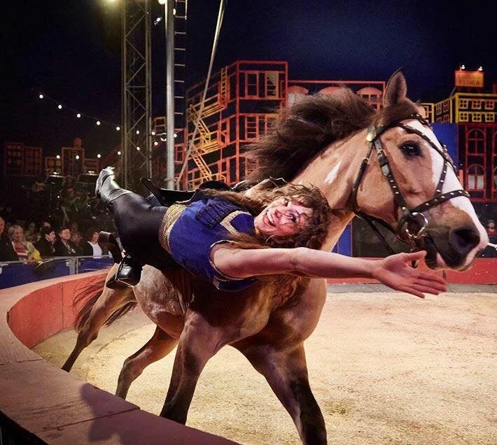 Acrobat Virgile Elana performing with Giffords Circus. This is an example of equestrian vaulting.